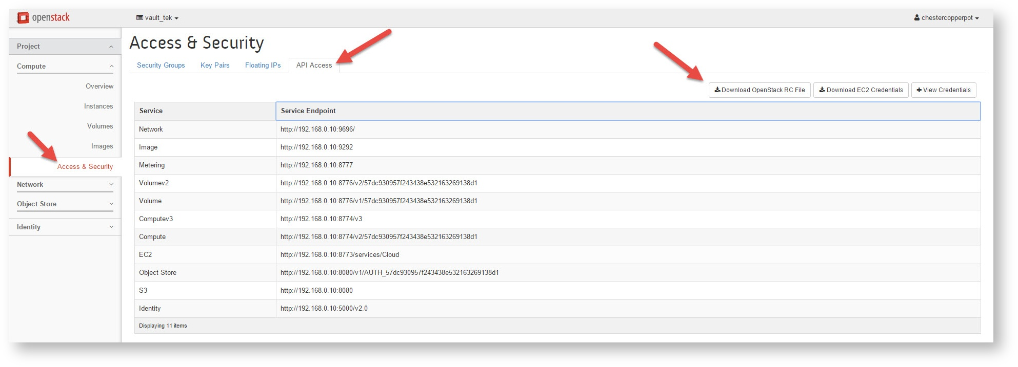 4. Using the OpenStack Horizon Dashboard to assist in creating a keystonerc file for new user Doris Day of Vault Tek