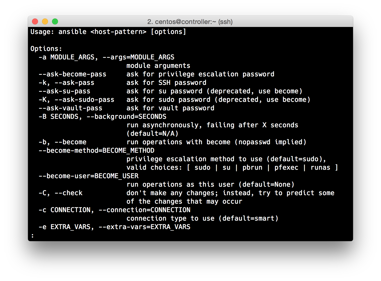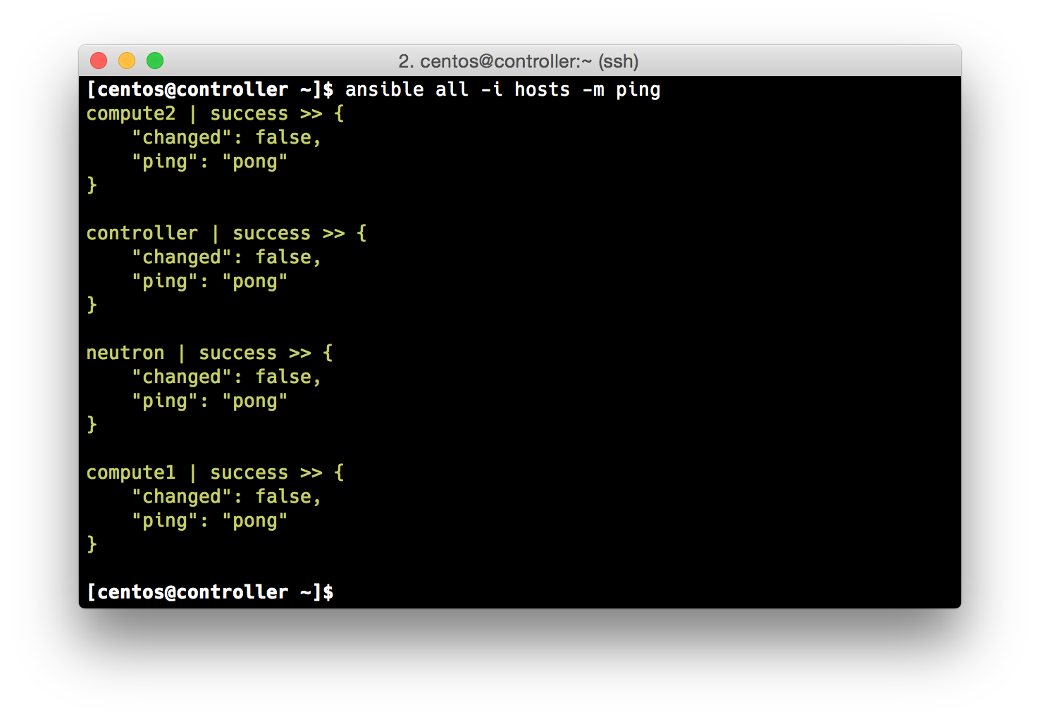 [centos@controller ~]$ansible all -i hosts -m pingThe "all" pattern targets all hosts in the inventory -i specifies a certian inventory file (a listing of hosts) "hosts" is the traditional inventory filename. -m specifies a certian module, in this case "ping"