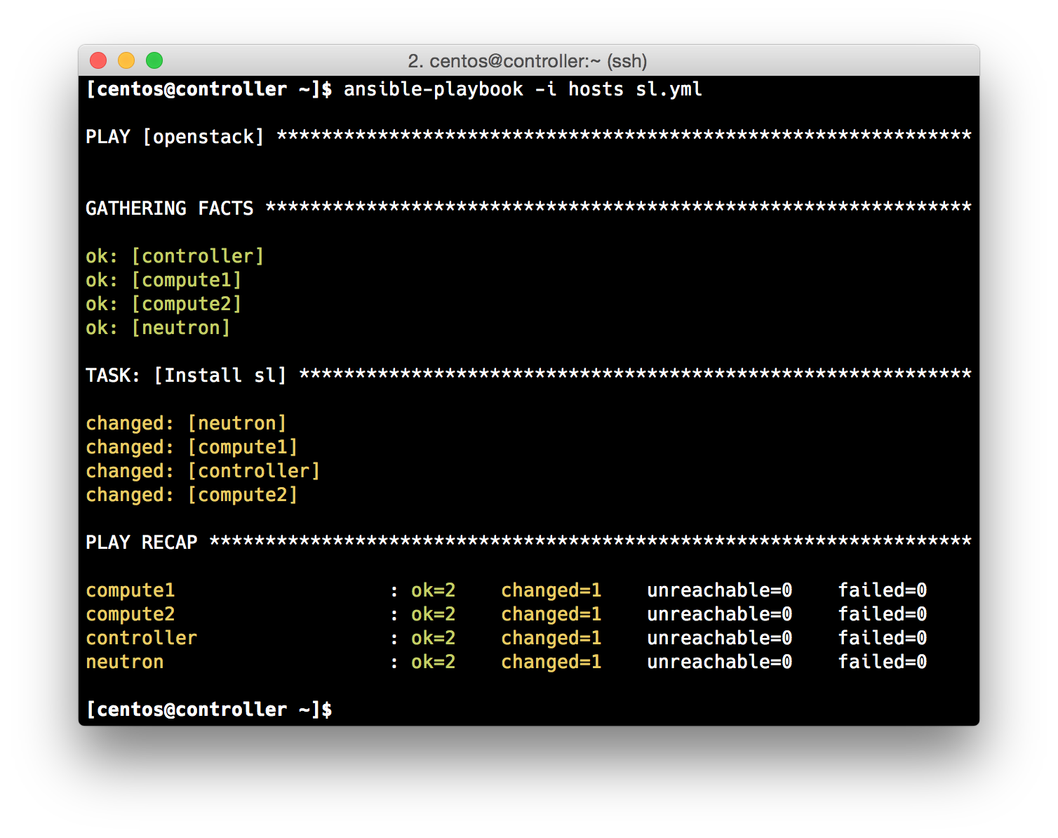 PLAY RECAPis different[centos@controller ~]$ansible-playbook -i hosts sl.yml -