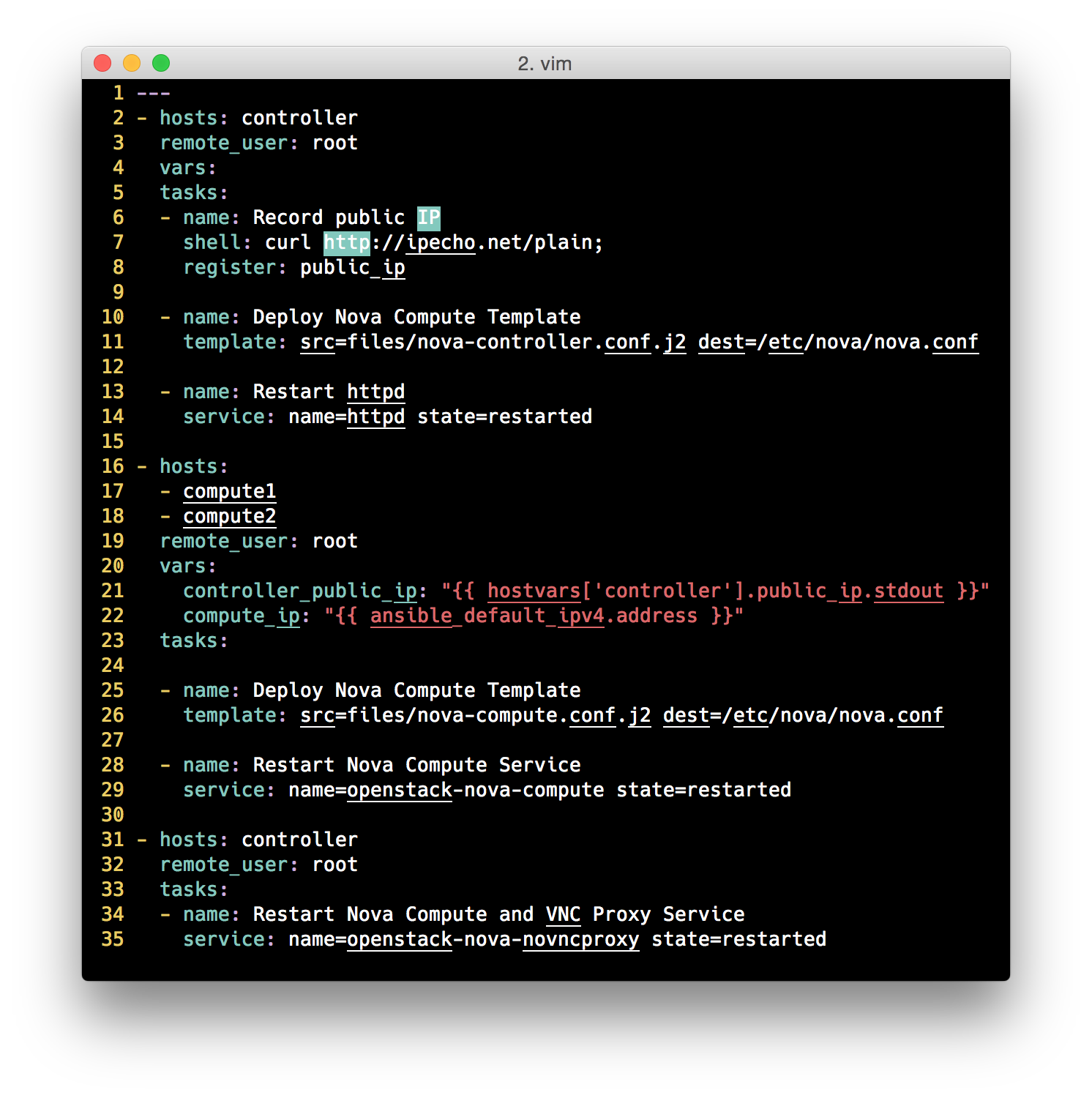 vncrelated parameters, let's filter on that[centos@controller ansible-novnc]$grep vnc files/nova-controller.conf.j2[centos@controller ansible-novnc]$grep vnc files/nova-compute.conf.j2 -