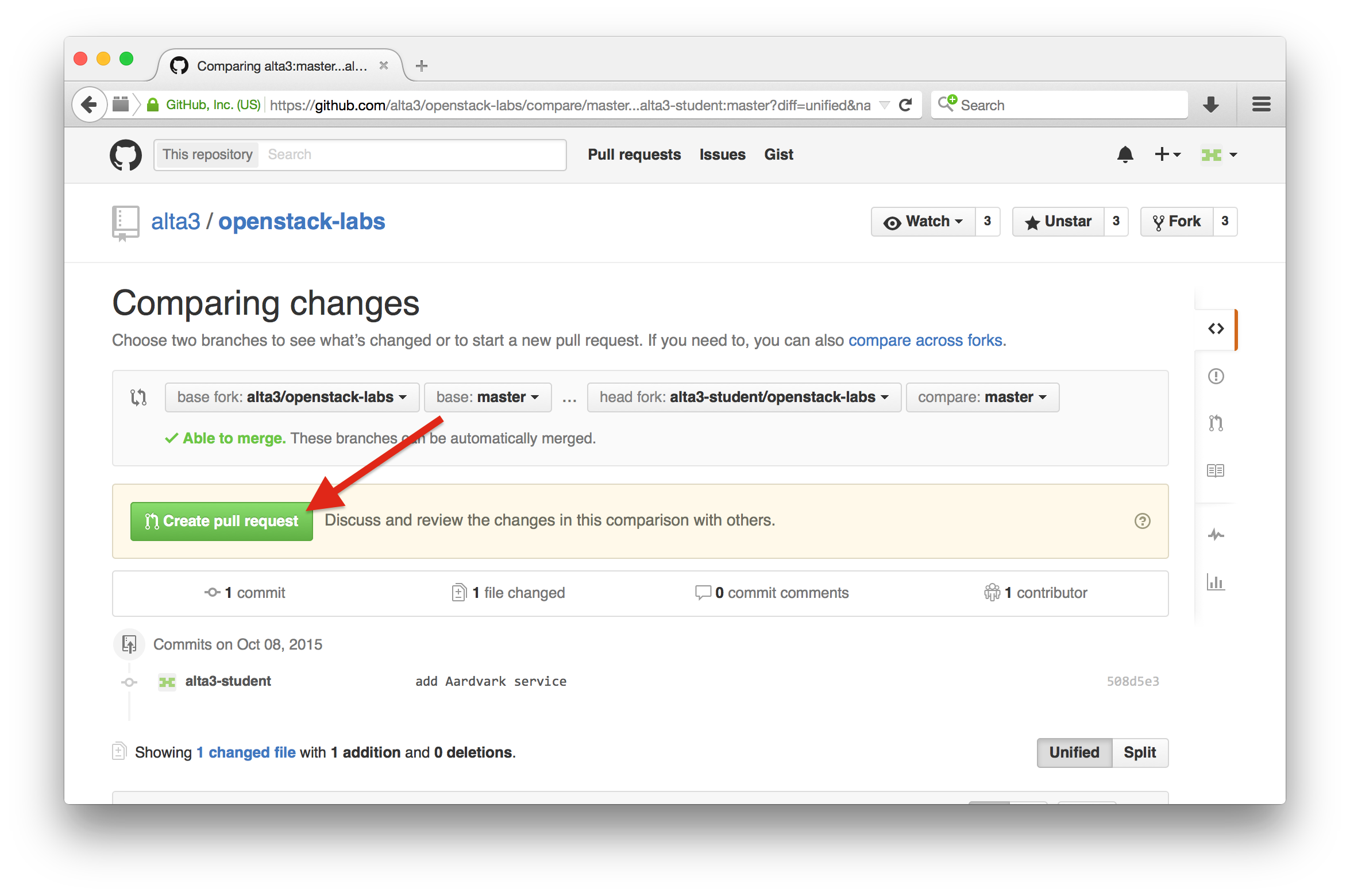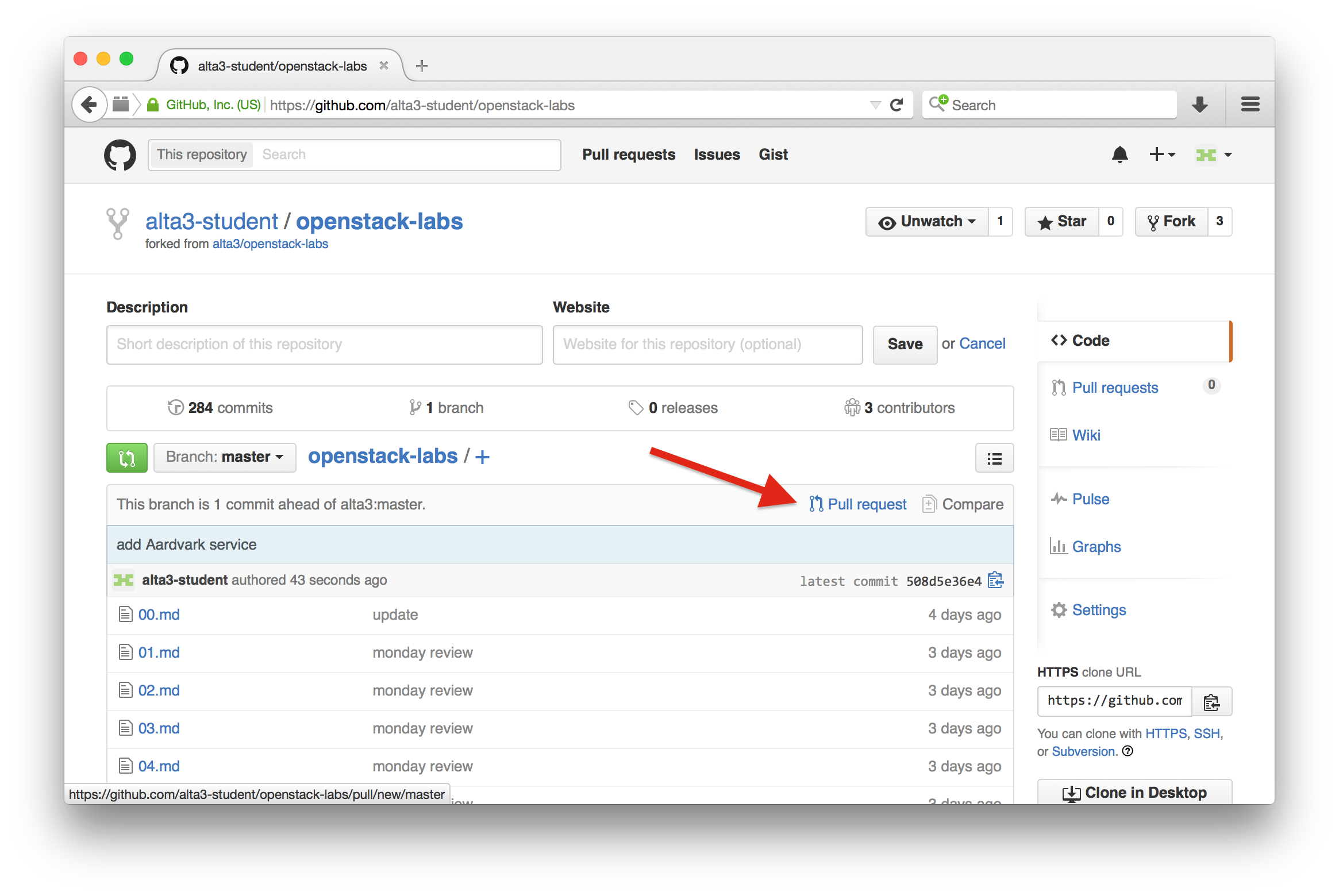 Navigate back to the project base page. Notice that our branch is now ahead of the master branch. Let's create a pull request to get our addition added back into the main repository. Click the "Pull Request" link.