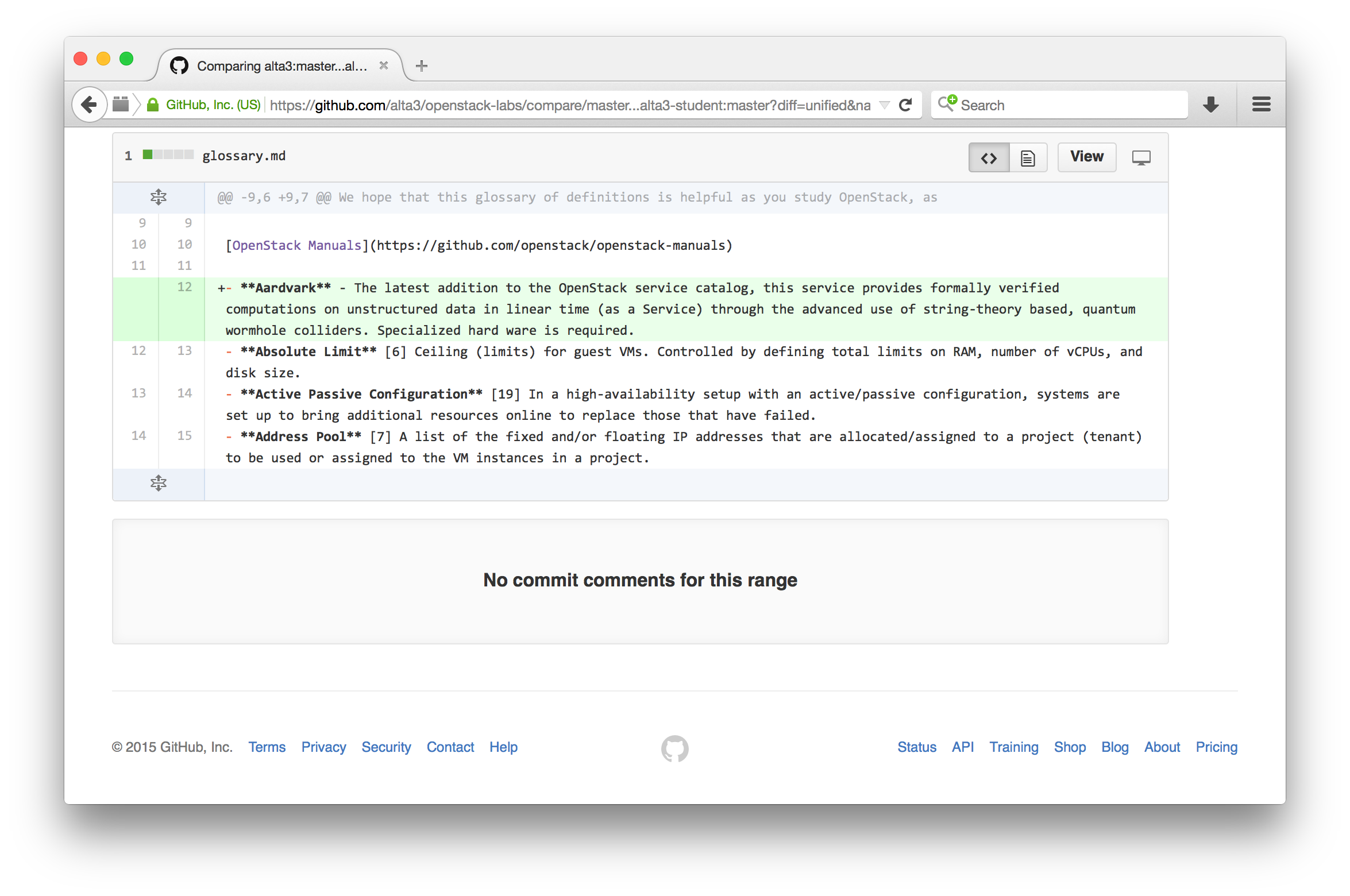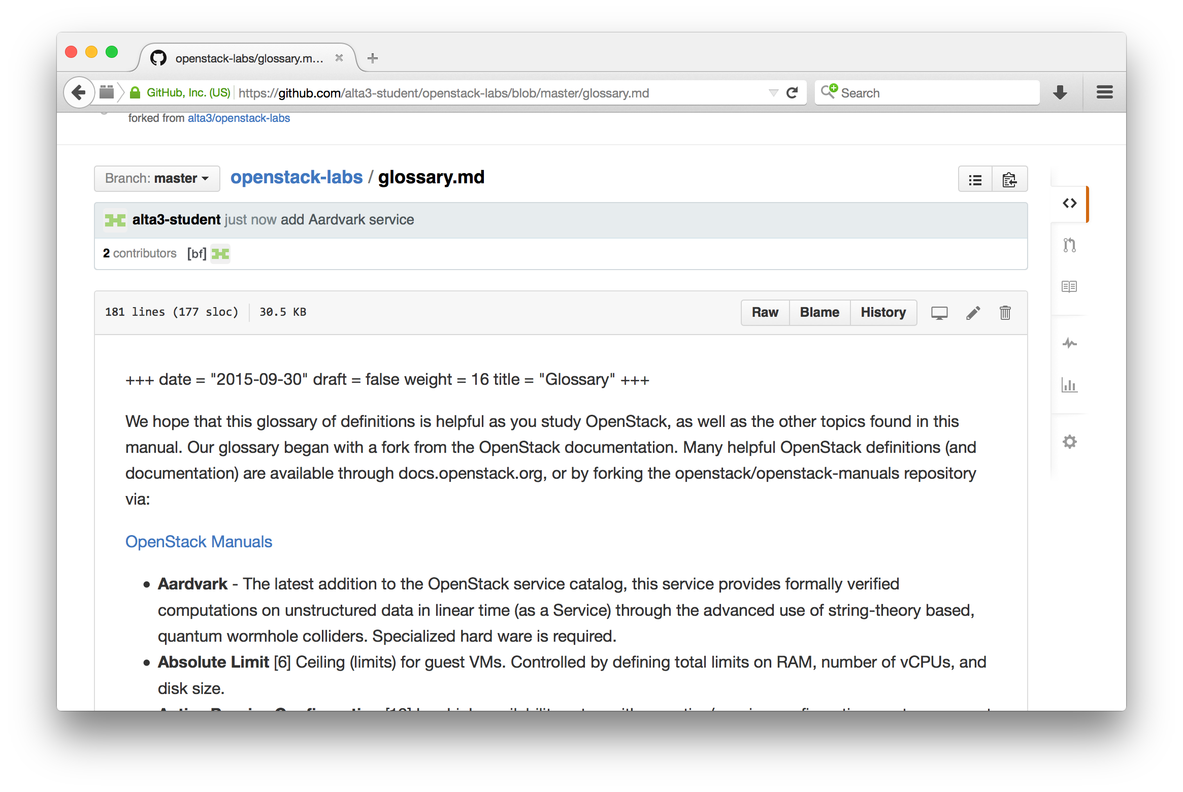 The objective of this lab is to give students a basic introduction to git and git pull requests. Many open source projects rely on git for decentralized collaboration including OpenStack.