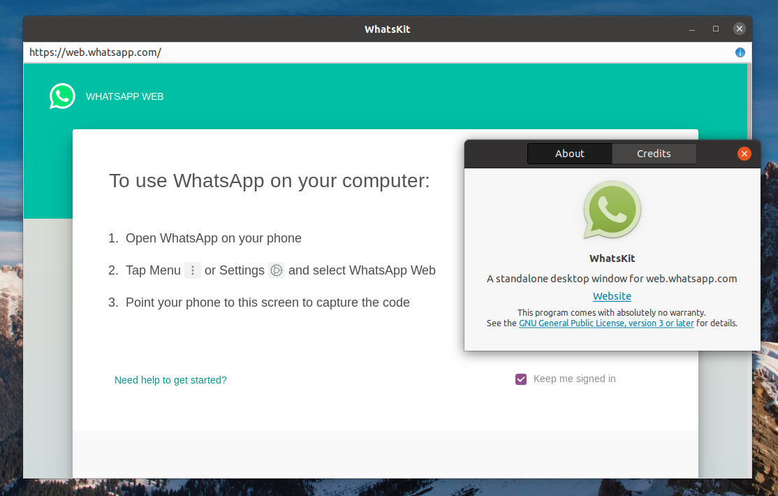A standalone desktop window for web.whatsapp.com. Useful if you don't want to keep your WhatsApp in your web browser, and you would like to have it in a seperate window.