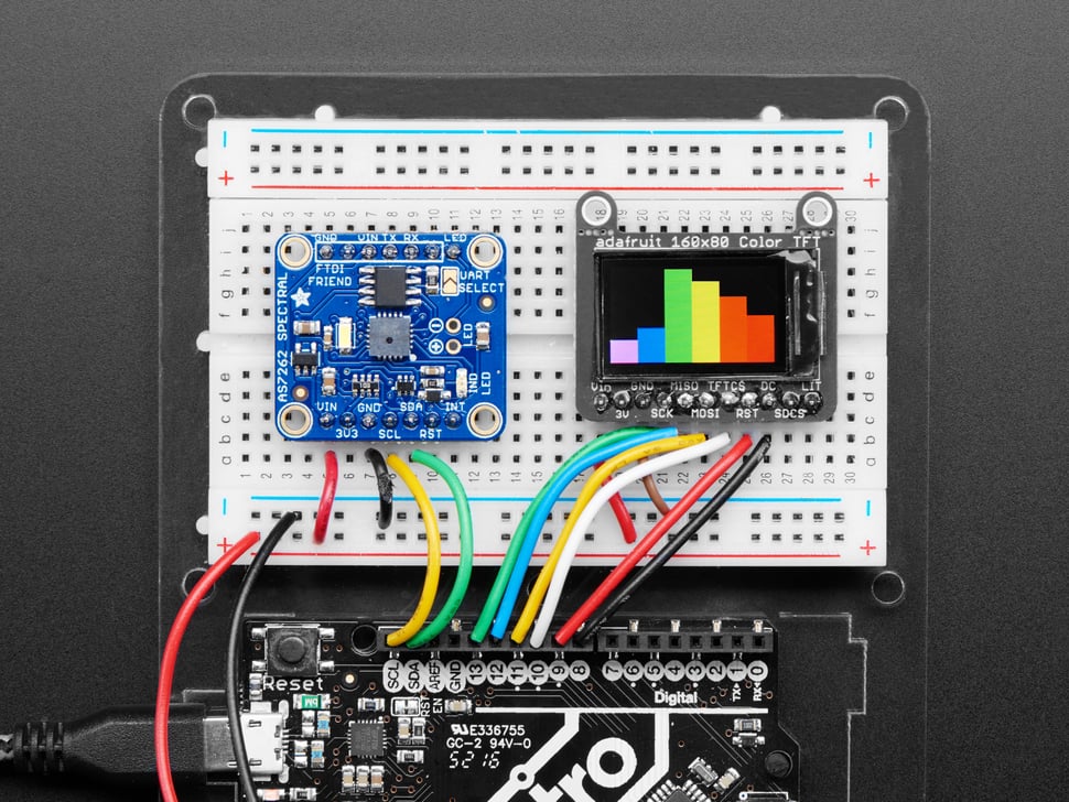 The AS7262 Sensor has 6 integrated visible light sensing channels for red, orange, yellow, green, blue, and violet. There is also an on-board temperature sensor that can be used to read the temperature of the chip. The 6 channels are realized by silicon interference filters at 450nm, 500nm, 550nm, 570nm, 600nm, and 650nm.