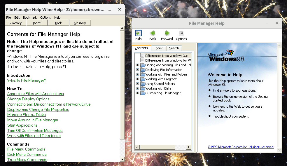 … HTML The original documentations for winfile, as extracted from the Windows 98 operating system, has now been ported to an open, and fully functional web based help system, complete with hyper-link support and table of contents. This represents the initial milestone "freeing" the documentation, making it easy to read on any device. And now that this is done, contributors can now easily add information to reflect the current state of the applicaion. Furthermore, I'm hoping to have the webpage that is stored on the reposity serve as a live, up-to-date, documentation for the applicaion, that can be launched right from the help menu. And, and the same time, with subsequent releases of Winfile, a forzen version of these documents can be distributed with the binaries, allowing that particular release enjoy a fully offline copy of the help files, as they were at the time of the release. This can be especially useful in older computers without internet access. I have not done extensive testing in all the differnt browsers, and, but it appears all desktop browsers are able to view the files perfectly fine. I have yet to test mobile browser compatibilities. But that's where the community comes in. By having the help file out there and easily accessible, it can be improved quickly whereas, before, the documentation was trapped in propriotary file fomates that were difficult to read. Best
