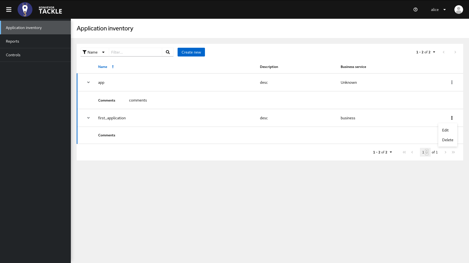Edit and Delete action are present under Kebab menu in application Inventory page