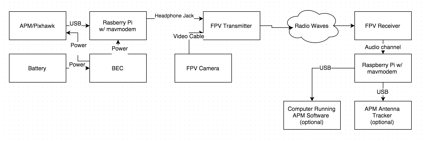 Using the audio channel of an FPV system we can reduce the number of transmitters on the APM powered vehicle. This may also aide pilots who do not possess an amature radio liscense get telemetry over a longer distance than bluetooth and APM telemetry module. An additional use case is that this may make it easier for pilots to choose between the 433MHz APM telemetry module and an LRS system (which majoritively run operate on the 433Mhz band).