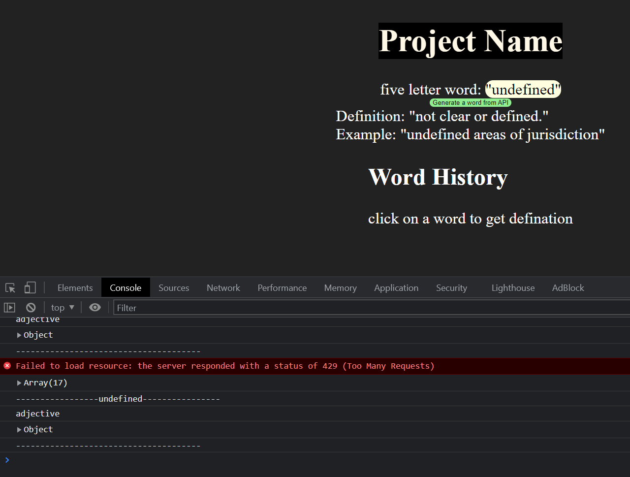 API for random word returned undefined due to too many requests.