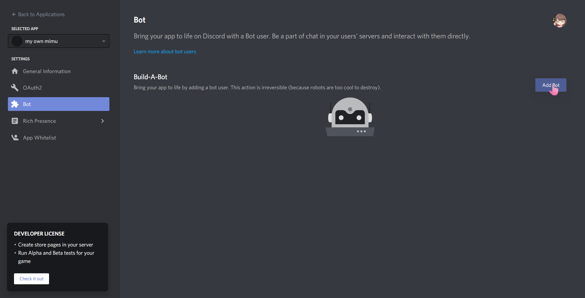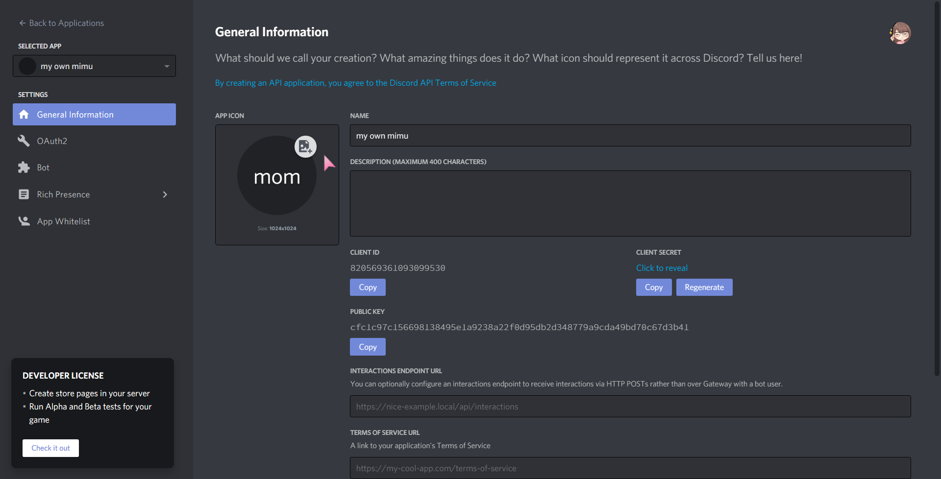 now you should see a control panel of your application. this is the place you'll be able to change it to be a bot and be able to edit its details in the future. go ahead and upload a profile picture if you'd like. i'm just gonna keep mine to "mom" for now :')