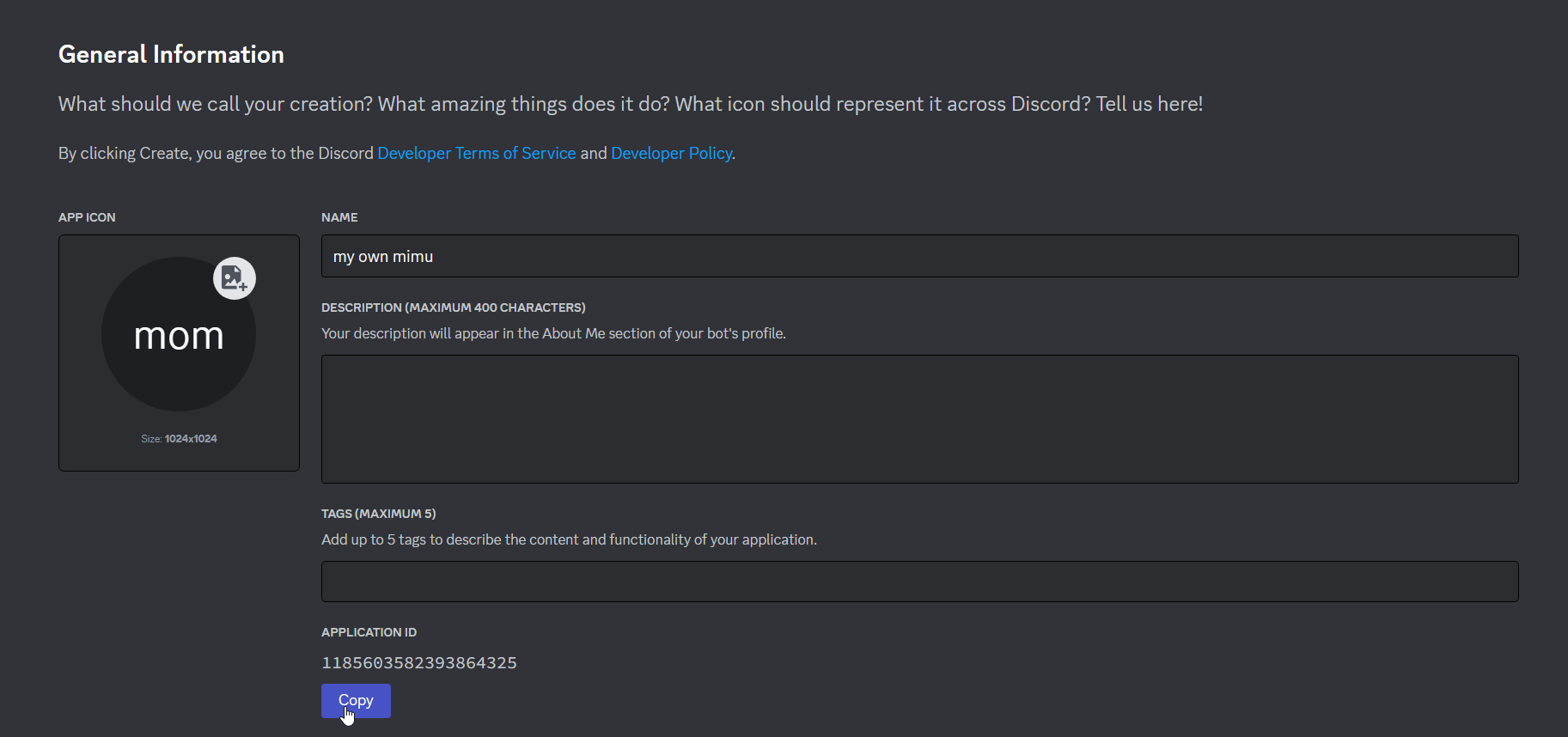 Okay! Now you just have to fetch your Client ID (or can be known as Application ID) and Token, make a private thread (instructions are in the mom-setup channel) and paste it there. Once you've done so, it will take me up to 3 days to set up (usually less than 24 hours).