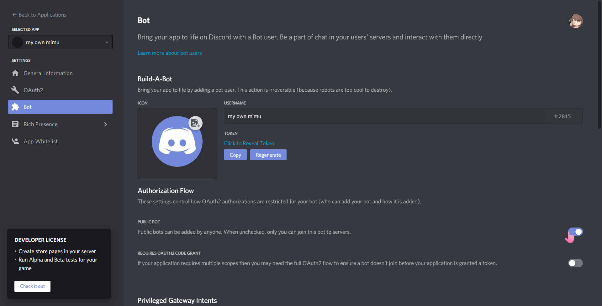 once you've done so, your page should look like this. make sure to leave "public bot" on for now - this is because i have to invite your bot to the mimu emoji server as mimu has some custom emojis it uses. i strongly recommend switching it back off when i'm done setting up, but it's not mandatory.