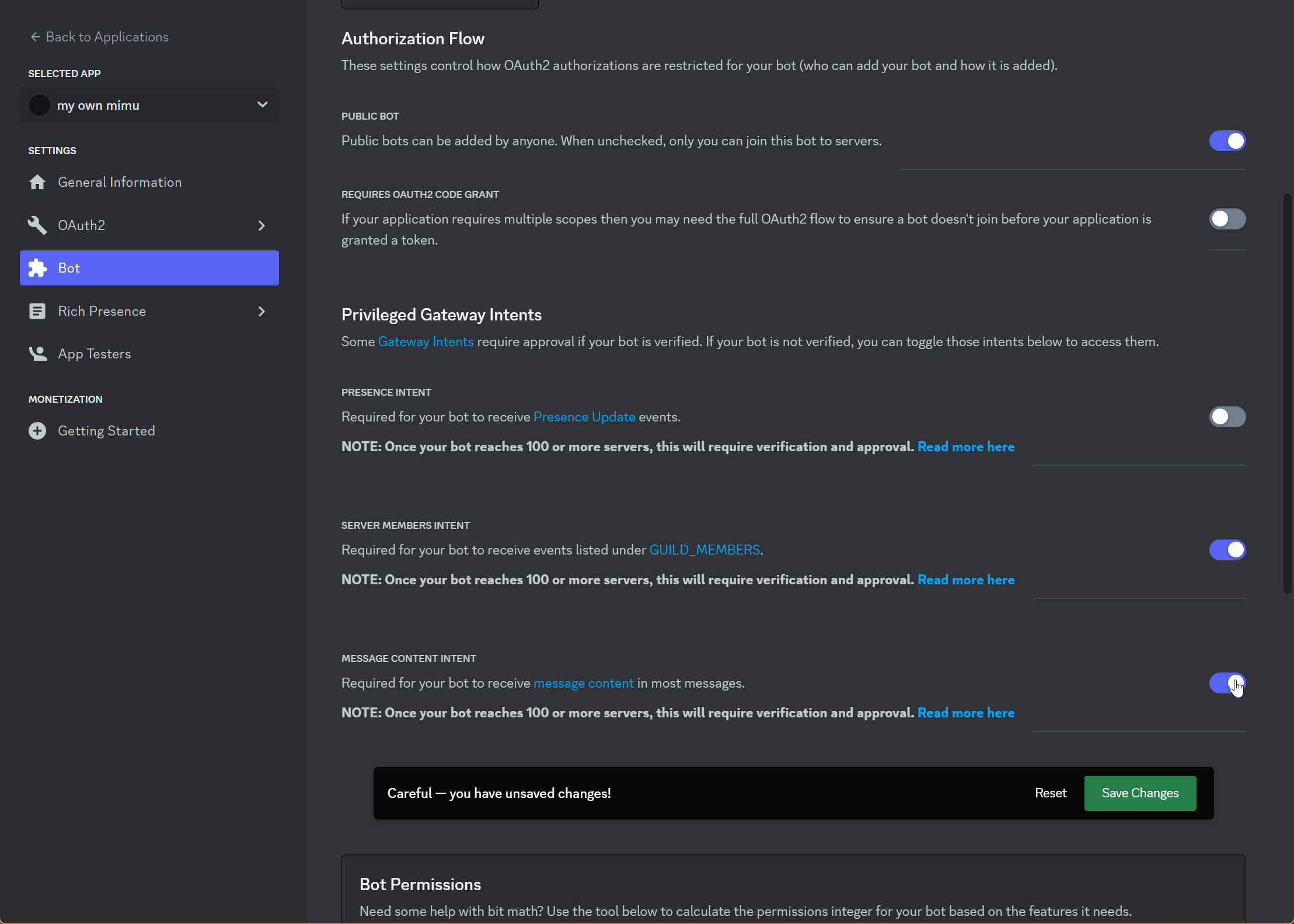 Alright, we're almost done. now scroll a little bit to uncover a section called "Privileged Gateway Intents". you're gonna need to activate the "Guild Members" and "Message Content" ones. Remember to save your changes!
