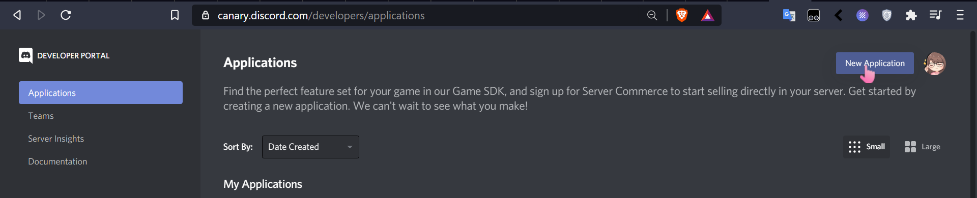 you should see something like this. at the top right corner, click new application: