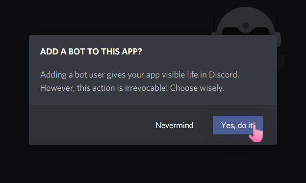 on the right of the page, you'll see a nav bar. click "Bot", then "Add Bot", then confirm: