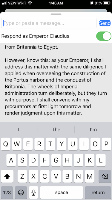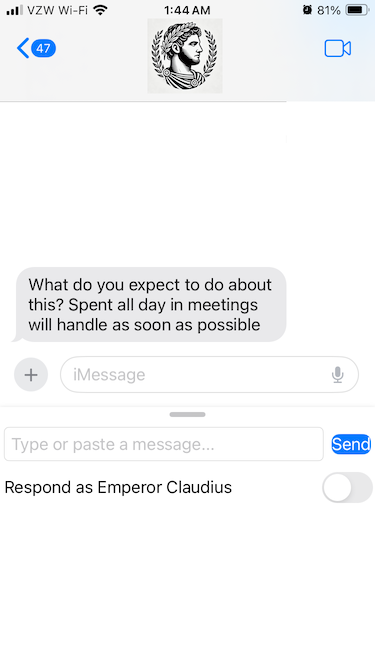 iClaudius is an iMessage extension that uses the Anthropic Claude API to generate responses to texts as the Roman Emperor.