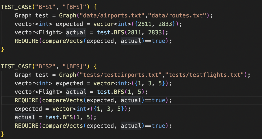 To answer the first question, we created a "Find" function. We decided to take in two IATAs before using our BFS function in order to get a vector of all the flights visited in the path. Our BFS implementation maintains a queue of flights.