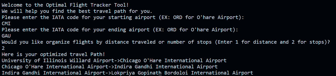 Finally, here is a working example of our project. As we are located in Champaign, we wanted to figure out how to get to our group member Manit's local airport in India.