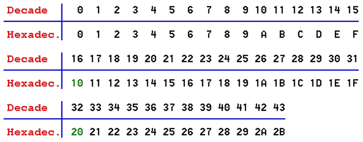 - In decimal you count "0,1,2,3,4,5,6,7,8,9,..." but then you run out of symbols!So you add 1 on the left and then start again at 0: 10,11,12, ...