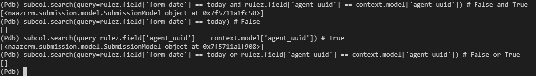 objs = pagecol.search(query=rulez.field['form_date'] == 'not today date' or rulez.field['creator'] == request.identity.userid)