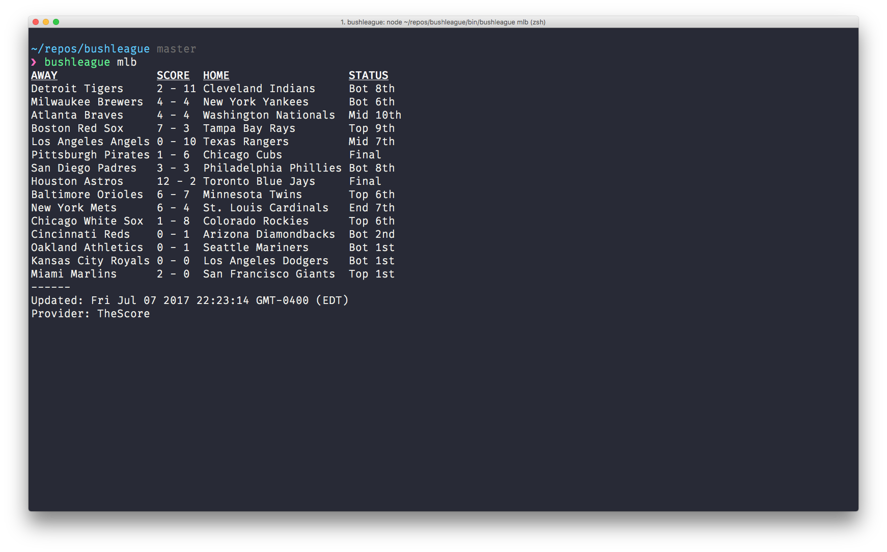 Ever wanted to check sports scores without leaving the safety of your terminal. We'll the struggle is over. Introducing Bush League. Simply pass in the league you wish to get updates for, and like magic your terminal is updated with all the scores of the night.