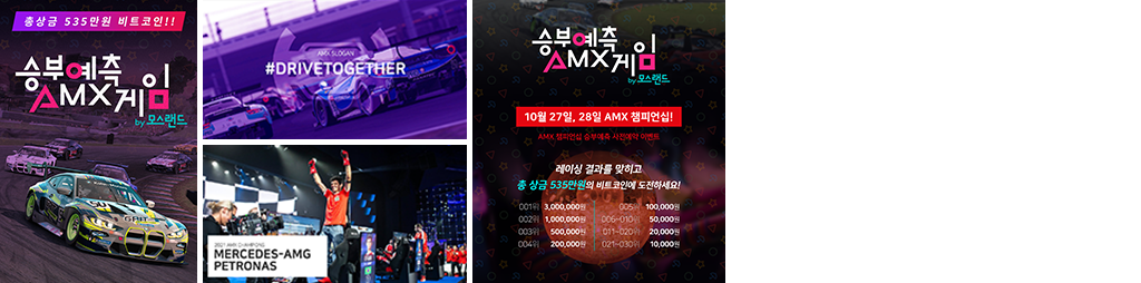 한국 최초 프로 e스포츠 레이싱 대회 “코오롱 AMX e스포츠 챔피언십”의 승부예측 이벤트를 AMX와 모스랜드가 함께 진행합니다. “코오롱 AMX e스포츠 챔피언십”는 AMX와 주식회사 아프리카 콜로세움이 공동으로 개최하는 e스포츠 레이싱 대회입니다. 2021년 10월 27일, 28일 양일간 이벤트가 진행됩니다.