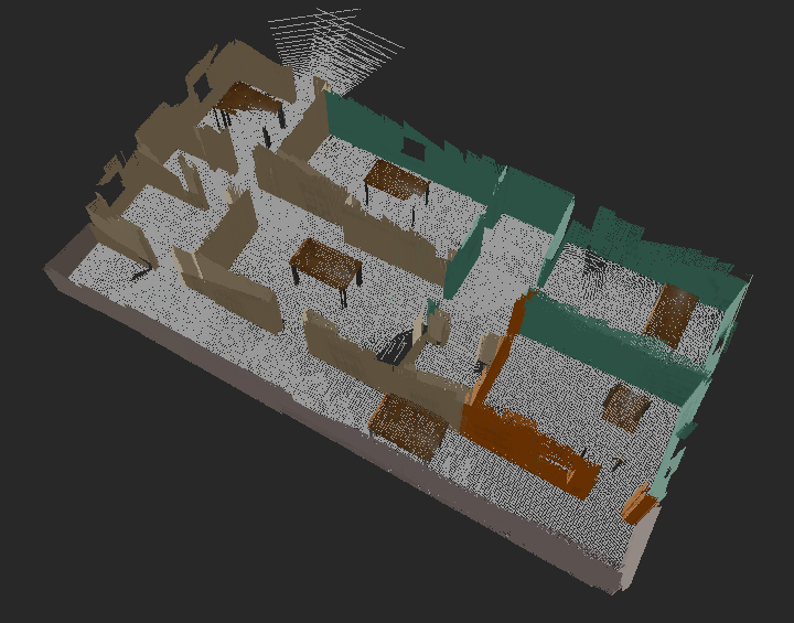 $ ./test_slam.shYou can teleoperate the robot around the environment in order to map it. The 2D and 3D maps of the environment are shown below.