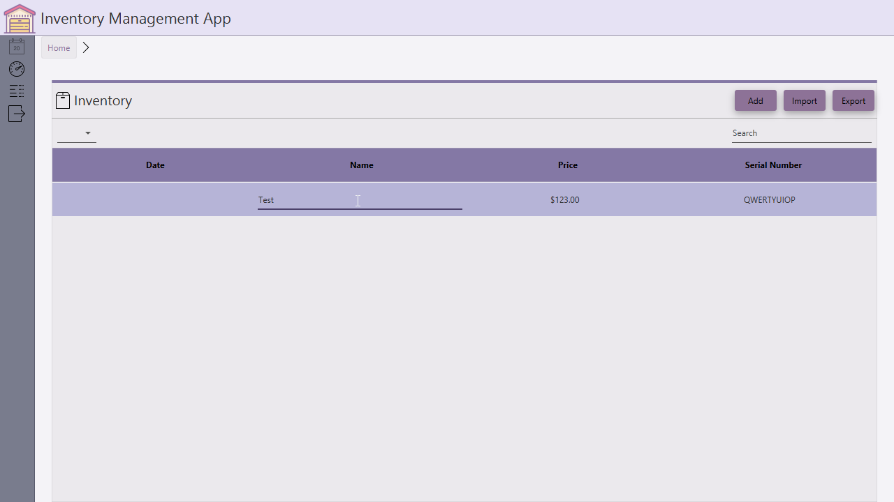 This program allows user to add, remove, edit, export and import items. Each Item have 4 properties that can be defined by the user (3 of them have to be difined and 1 is optional) Properies which have to be initialized are Name, Price and Serial Number (Date is optional).