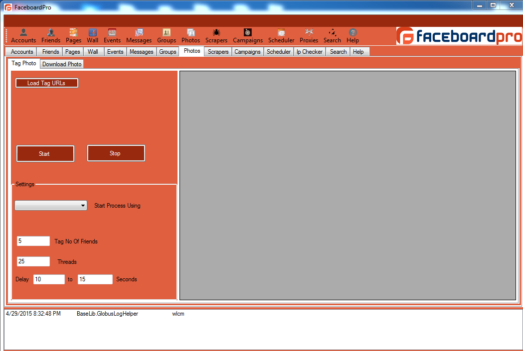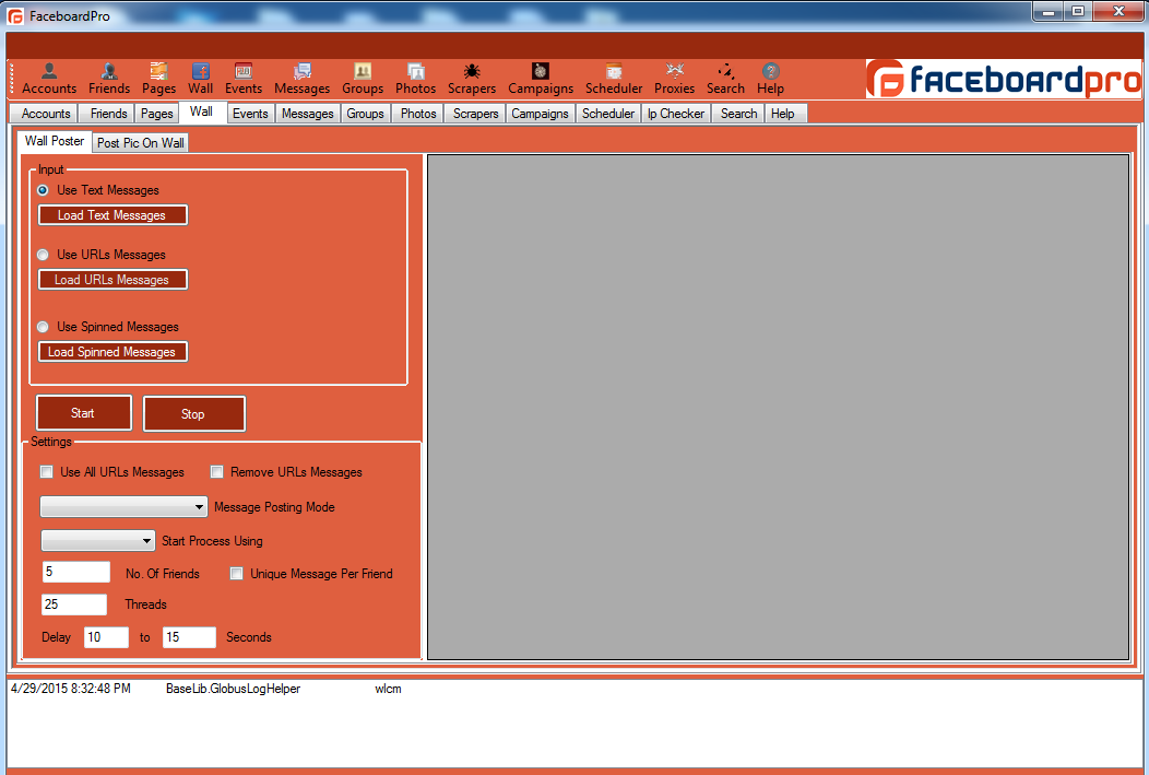 Wall Management: This feature allow you to post pic on your wall/timeline with wall poster option. You can post pics on your timeline through loading targeted URLs, greeting messages or through one of your folders in your PC. Wall poster option allows you to update your wall and your friends wall status with a video link, simple message or spinned text messages with a simple click.