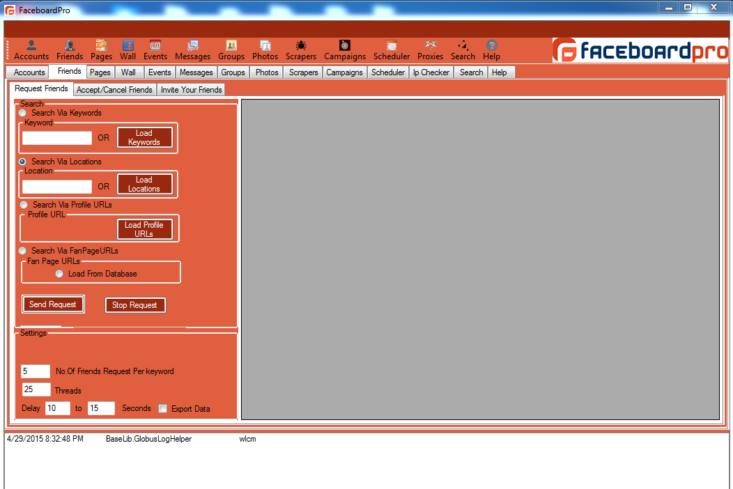 Friends Management: The friend management option provide 3 features: request friends, accept/cancel friend request and invite friends. You can add targeted friends in your account. Targeting can be also done based on Geo-Location or from fan pages. You can send friend request via name, locations, profile URLs or Fanpage URLs. You can also upload mobile number or email_ID of your send him/her an invite.
