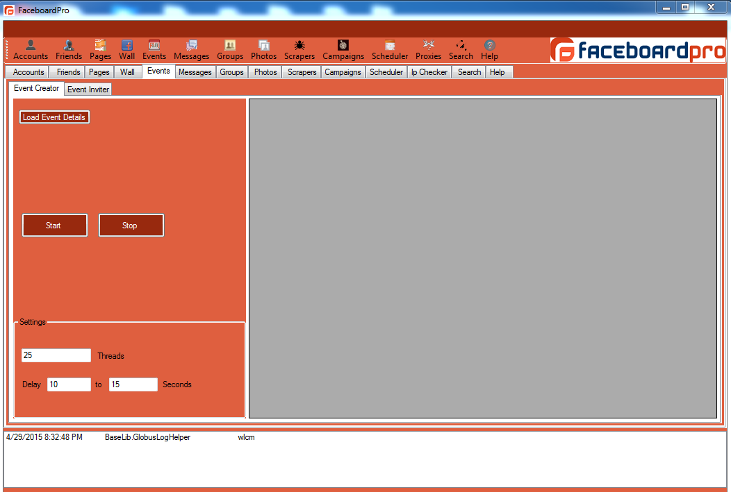 Event Management: This feature provide complete management of Events on Facebook. You can create event on your uploaded account, load event details, invite friends to events, and load other event URLs as well as you can also select the number of invites at one time.