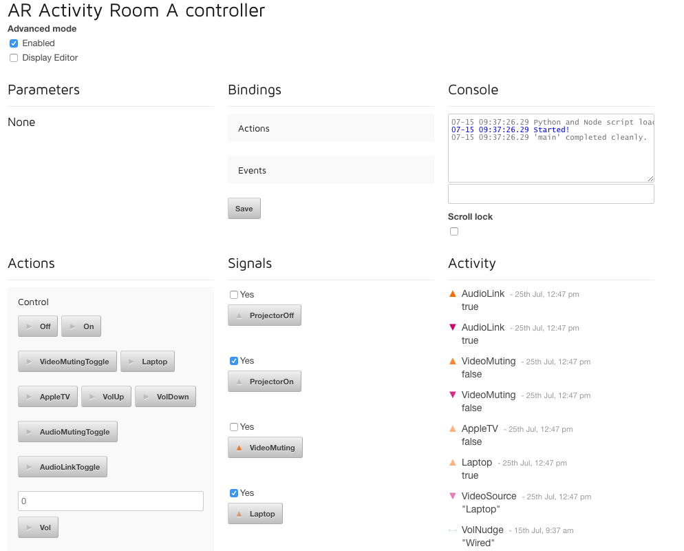 These nodes are discoverable from other nodehosts on the same network, by which a series of user specified bindings allows the seamless propagation of remote actions and signals between a group of nodes.