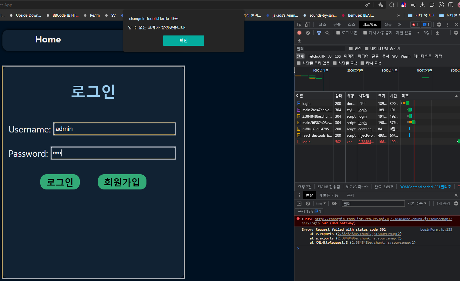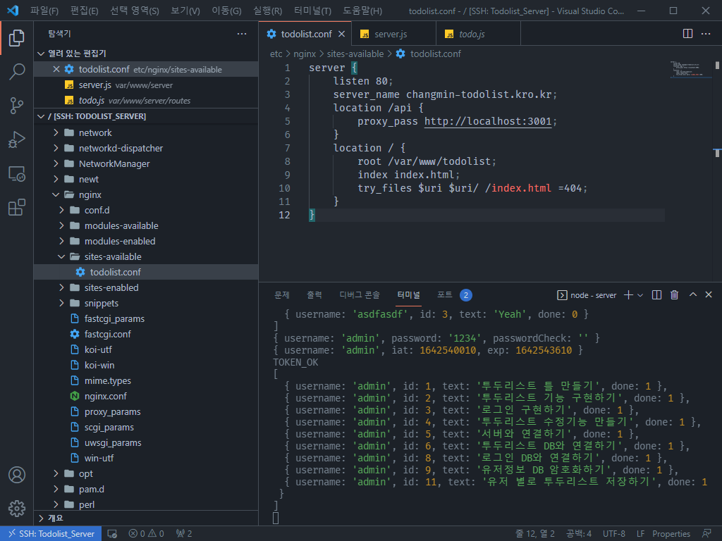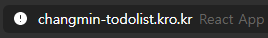 4. 내도메인.한국 에서 도메인 등록이 단계를 끝내면 아래 사진과 같이 IP가 아닌 자신이 설정한 도메인으로 투두리스트에 접속할 수 있어야 함