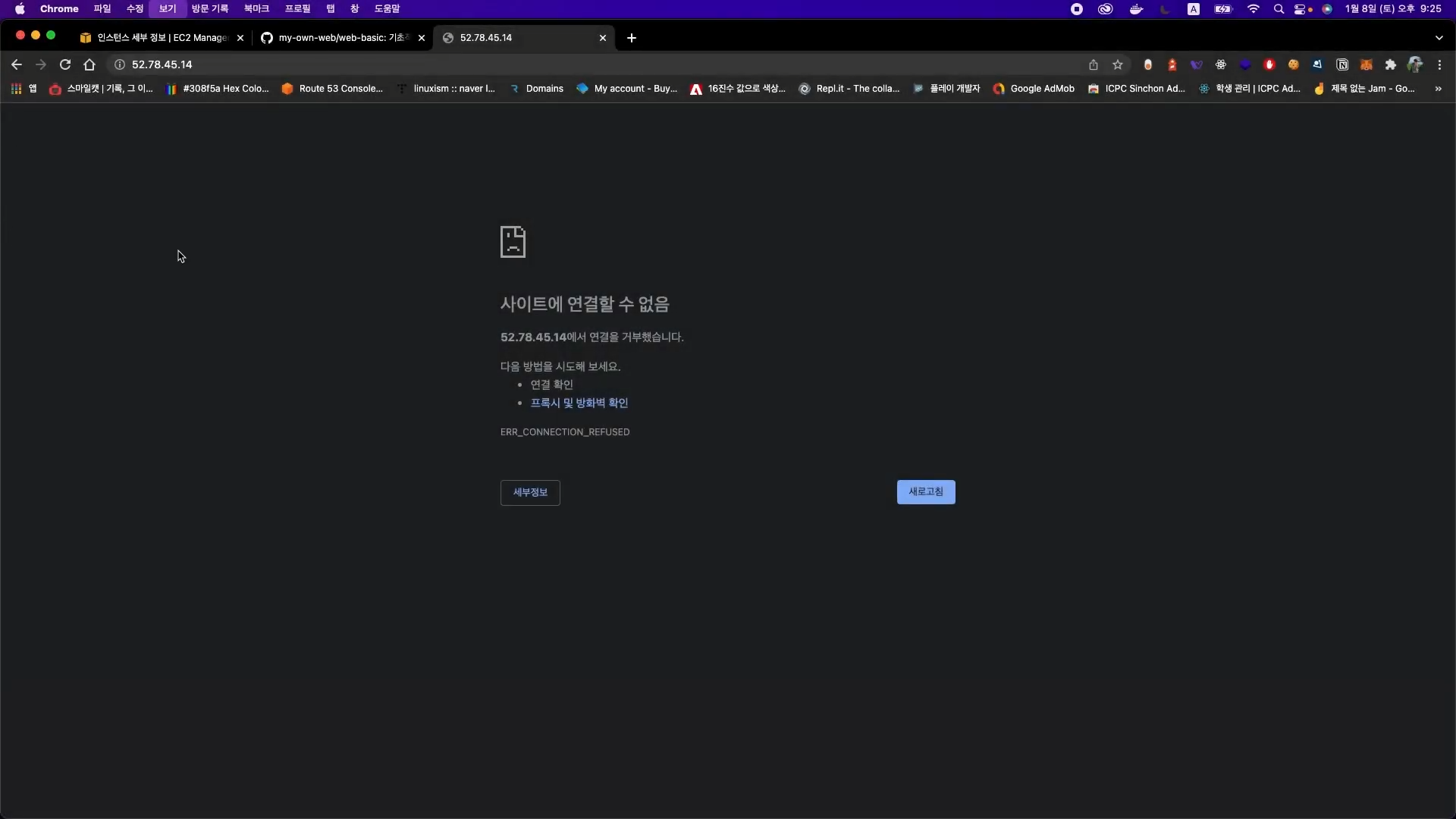 . . . . AWS 이용해 웹호스팅1. AWS 계정 생성 & EC2 인스턴스 생성이 단계를 끝내면 아래 사진과 같이 퍼블릭 IPv4 DNS를 주소창에 입력해 들어갔을 때 ERR_CONNECTION_REFUSED가 떠야함