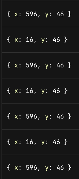 For example, after toggling the position of the box a few times, the console.log(box.x, box.y) call in line 8 of the sample results in this output: