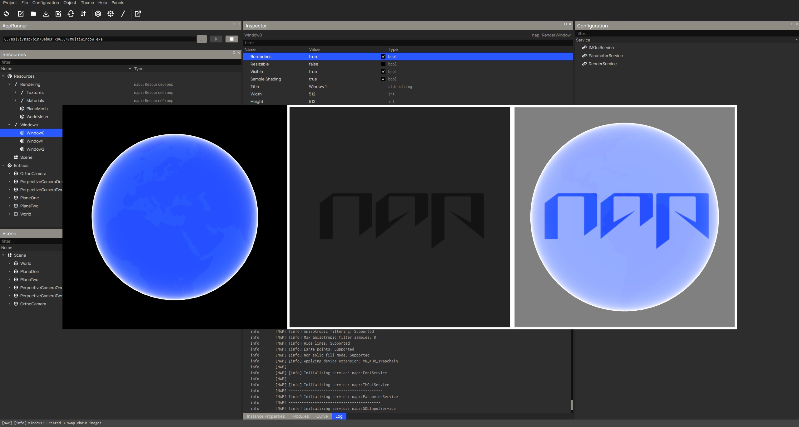 Multiple applets can run at the same time, without interference unless requested. They're all bound to their own thread and all resources are local to that thread, including: core, the resource manager, spawned objects, services, the render engine etc. Currently, Napkin uses applets primarily for previewing assets like textures and meshes, but they can also be launched in any host environment as fully functional, standalone NAP applications. And you’re not limited to just one—you can run as many as you need.