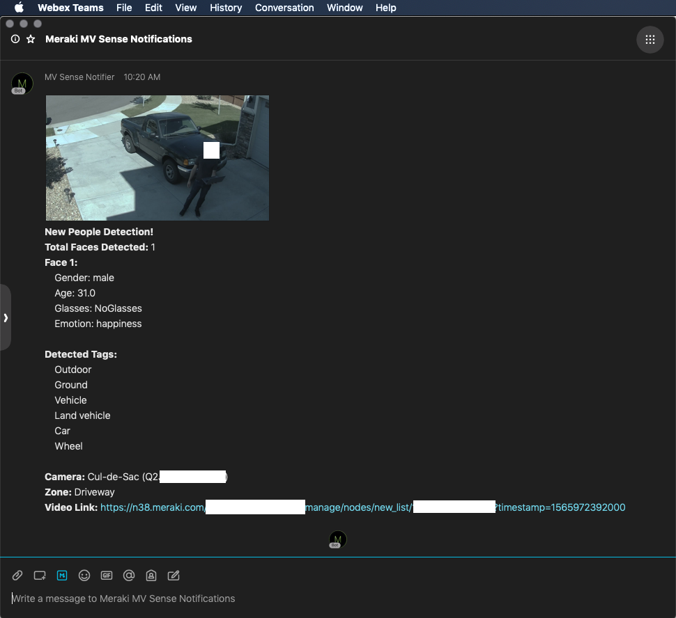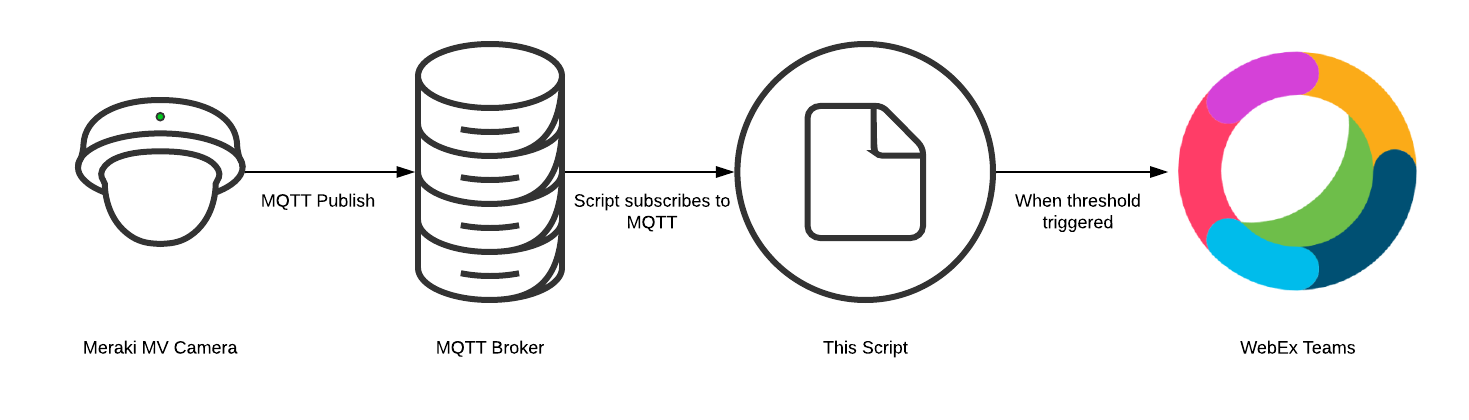 This script leverages Meraki's camera API and MQTT as part of MV Sense to create a notification service. When the camera detects a defined number of people in a particular zone the service will send a Webex Teams message with a snapshot and a link to the video footage.