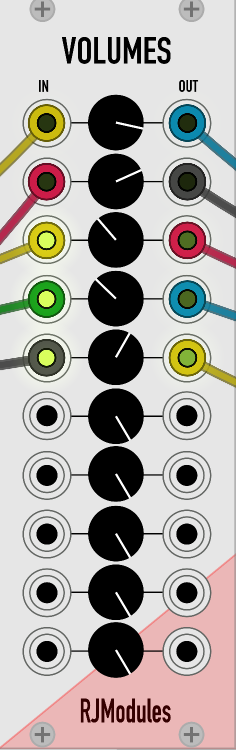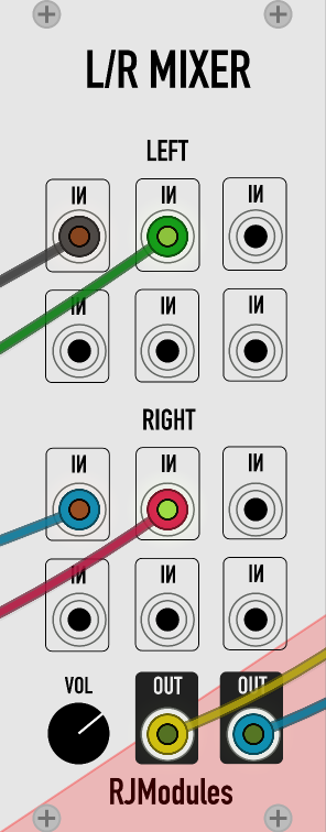 A simple 12-to-2 mixer for mixing multiple stereo signals. With an additional overall voume knob.