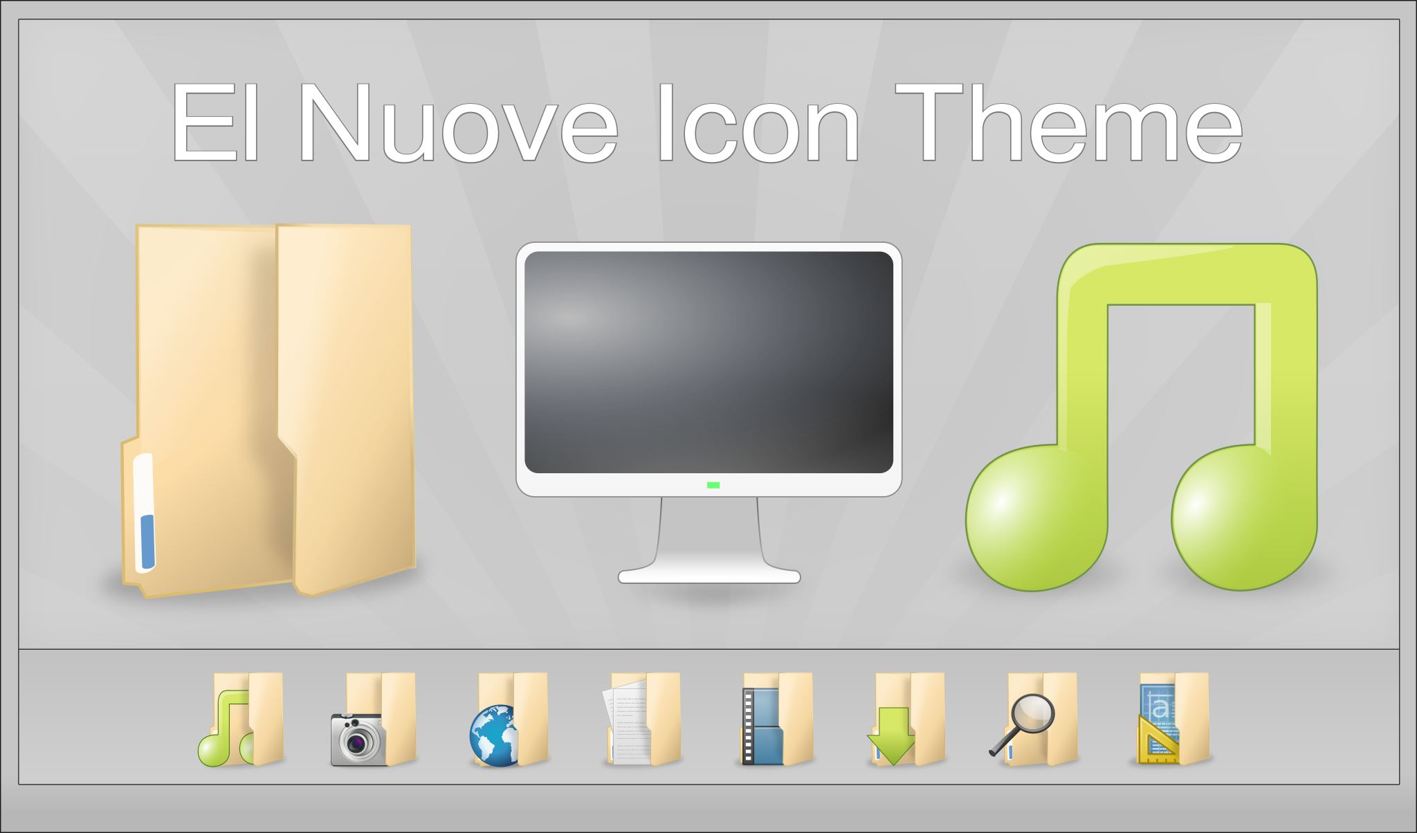 An Icon collection I made many years ago, a recreation of NuoveXT icons as SVG with additional icons from the elementary icon theme, tango, gnome, Meliae, and Faenza (and a few poorly made original icons). This theme is pretty rough, I was just learning how icon themes worked at the time and learning how to use an SVG editor. (Inkscape!) Originally called Victory Icon Collection, I renamed it El Nuove to reflect that most of the icons here are from or edits of the Elementary icons and the NuoveXT icons.