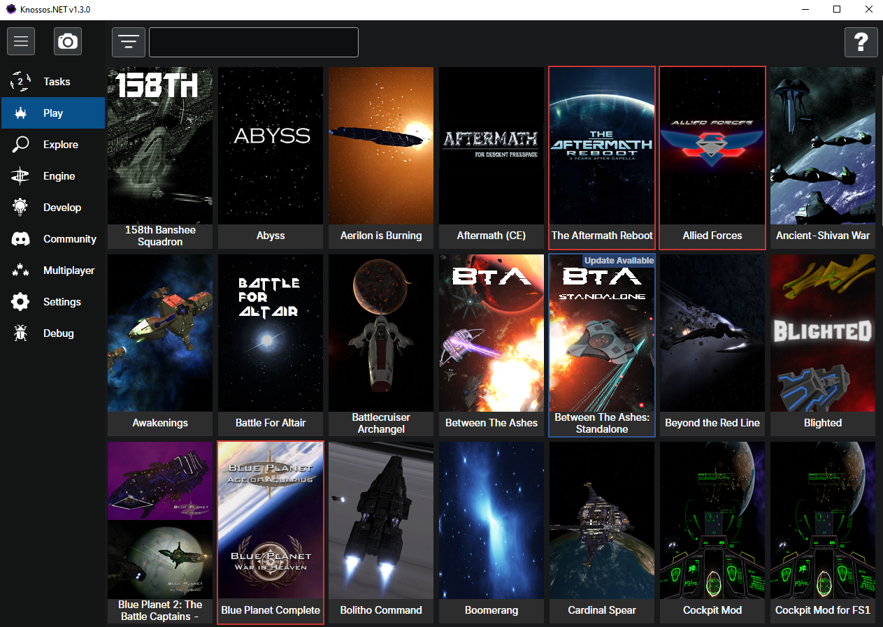 Knossos.NET offers greatly improved performance and stability over the old Python-based Knossos. Because it is written in C#, builds can be released much more easily. Knossos.NET also minimizes the amount of memory and VRAM used, so that slower computers will not suffer performance penalties when running FSO. Knossos.NET furthermore supports compressed VPs, it can create compressed VPs when using the dev tab, and it can detect duplicate installations and hardlink them, reducing hard drive footprint. Finally Knossos.NET has additional features compared to original Knossos, while still maintaining feature parity. Some of these features are detailed below.