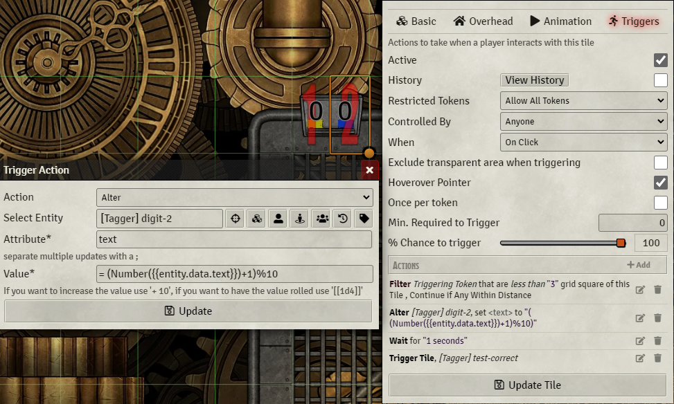 - Trigger Tile: Trigger the tile we set up to test for the correct combo, and if so, trigger the reward.