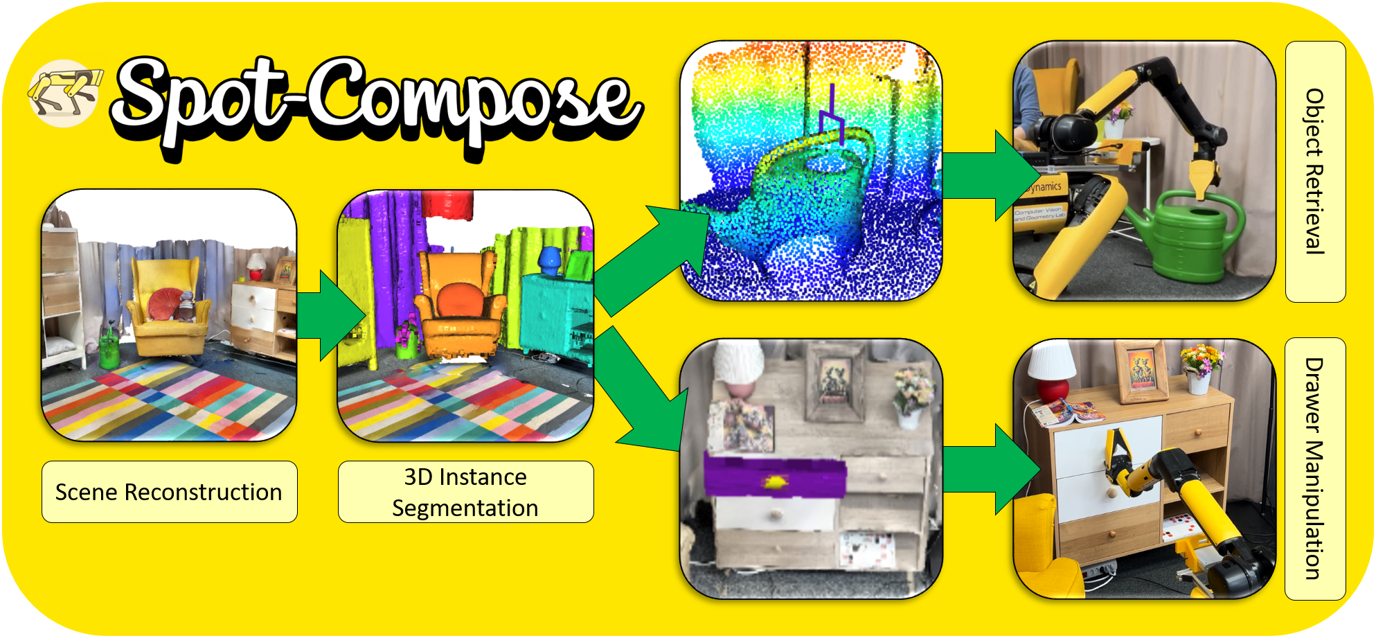 Spot-Compose presents a comprehensive framework for integration of modern machine perception techniques with Spot, showing experiments with object grasping and dynamic drawer manipulation.