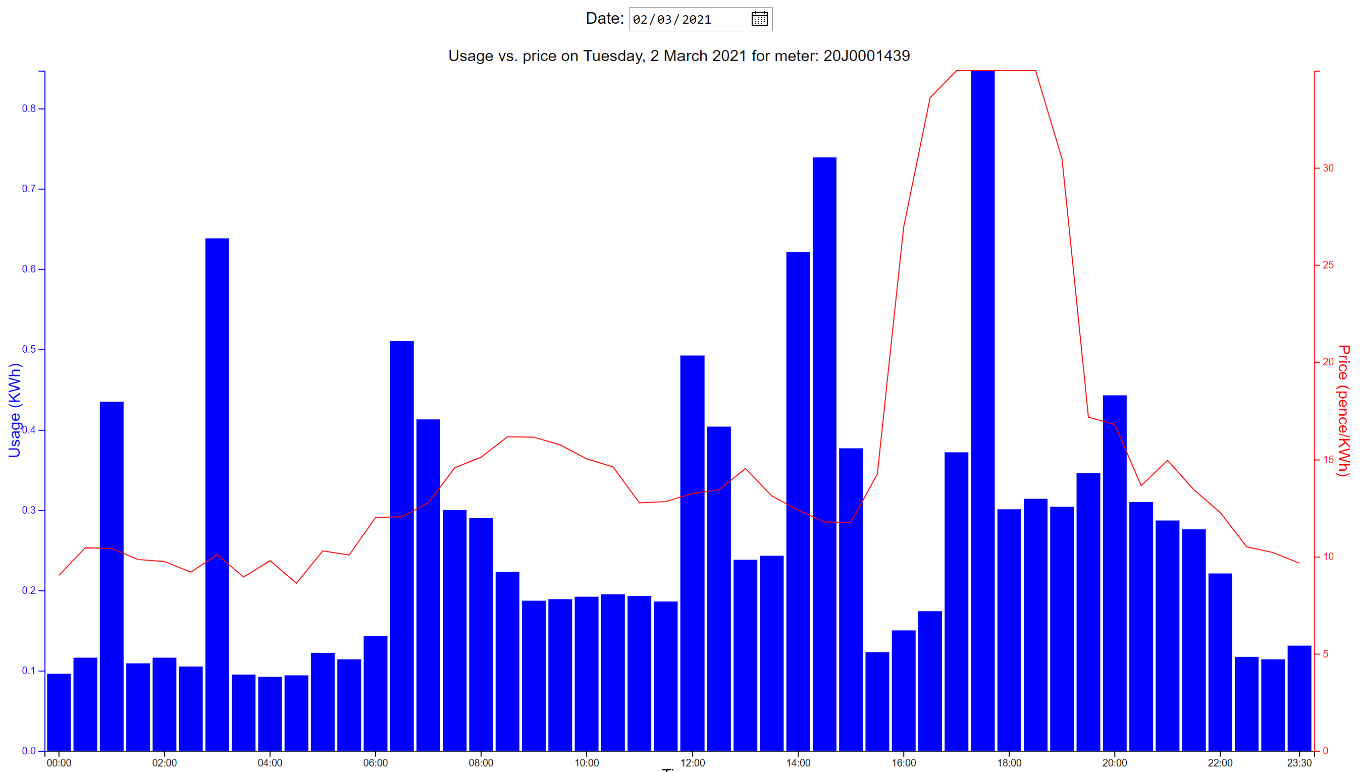This project uses the D3.js library to show Octopus agile electricity usage verses price for a particular day. All the processing is done client side, apart from two API requests made to Octopus Energy. The API for the usage requires details for the particular meter - these values can be found here: https://octopus.energy/dashboard/developer/