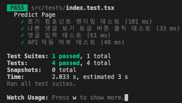 module.exports = nextConfig;$ npm run testjonna-sick/fe/src/tests/index.test.tsx 최초 setup을 위해 DOM, event를 미리 작성을 통해 test code의 가독성을 높임.