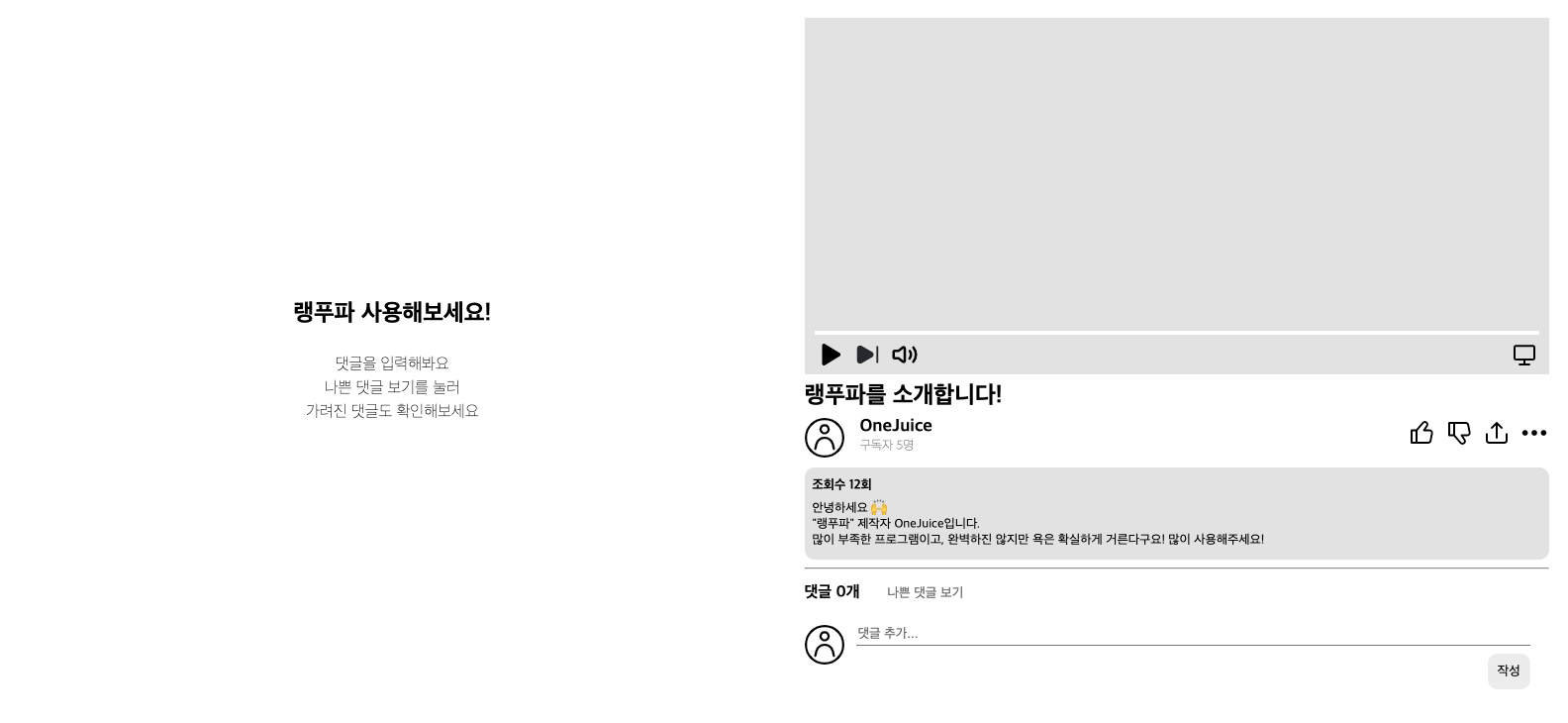 랭푸파는 유튜브 댓글에서 혐오적 표현, 욕설을 찾아내 댓글을 가려주는 서비스입니다.