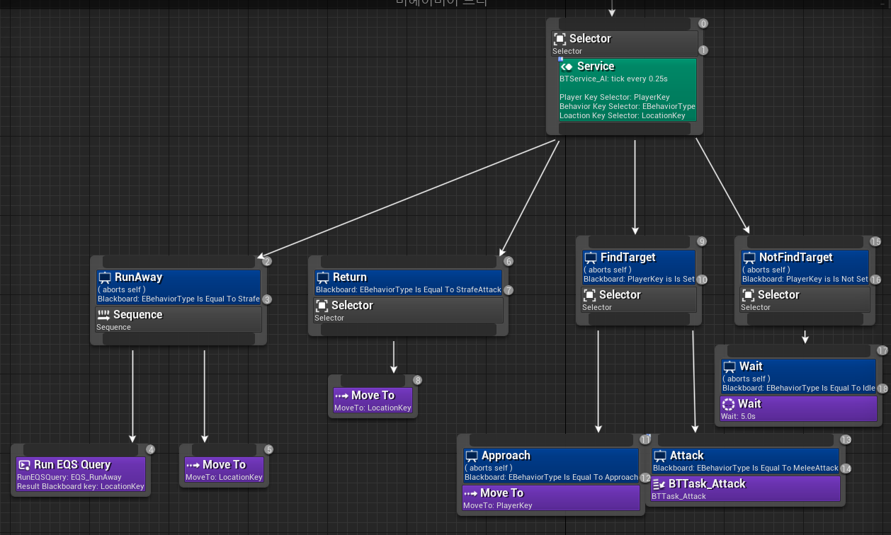 RunAway는 피가 20%이하가 되면 EQS를 돌려 Enemy에서 Player 방향과 Enemy와 Item 방향으로 내적하여