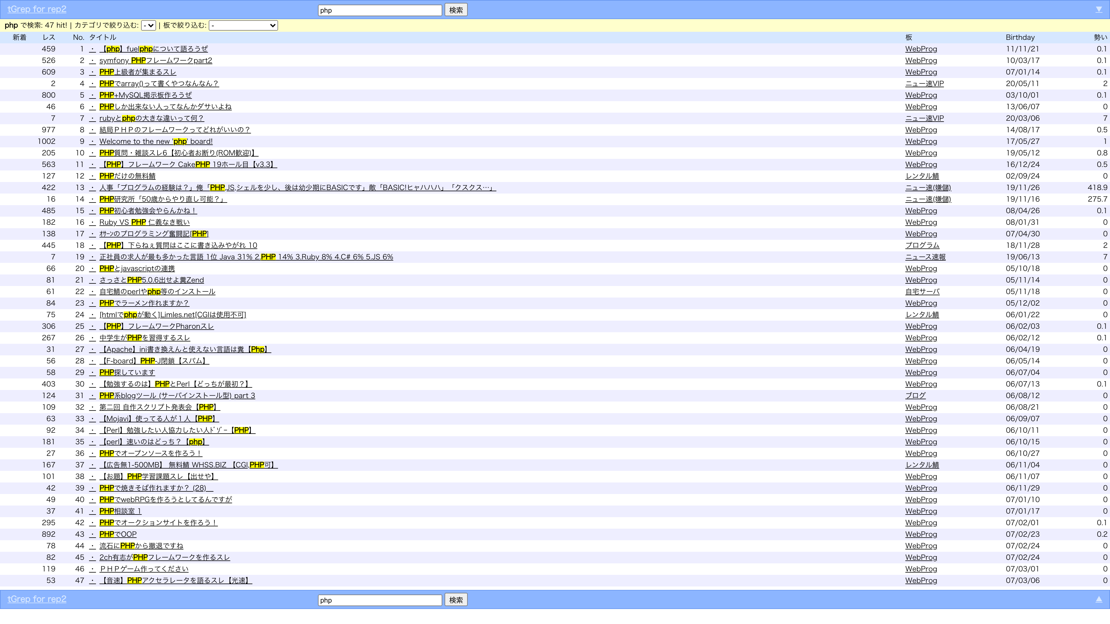 https://github.com/pen/docker-rep2/tree/php8 を作って動かしてみました。以下のレポートはこちらのコンテナの作り方が悪い可能性も十分あります。 PDO対応ImageCache2のDBをsqlite3にできるのはうれしいですね。これでコンテナにmysqlを入れる必要がなくなりました。 ImageCache2ImageCahceを有効にしてスレを開くと画像リンクをスキャンしてサムネイルを作ろうとしますが、 こちらではいったん設定値を 最近読んだスレ「最近読んだスレ」をクリックすると のようになり、Webサーバが500を返します。手元でsubject.php の当該箇所を にしたところ、表示はされるようになりましたが、いろいろなスレを読んでも「最近読んだスレ」に登録されません。 |
