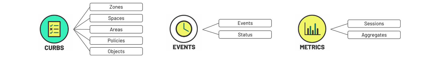 The Metrics API is a way to track curb usage session details and define common calculation methodologies to measure historic dwell time, occupancy, usage and other aggregated statistics. It defines sessions and aggregates data derived from raw Events data.