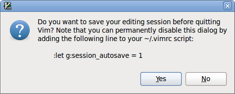 To persist your current editing session you can execute the :SaveSession command. If you don't provide a name for the session 'default' is used. You're free to use whatever characters you like in session names. When you want to restore your session simply execute :OpenSession. Again the name 'default' is used if you don't provide one. When a session is active, has been changed and you quit Vim you'll be prompted whether you want to save the open session before quitting Vim: