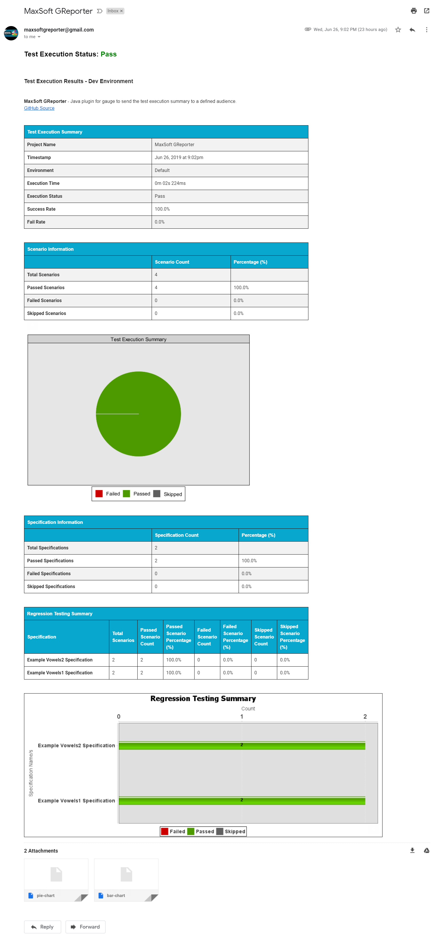 - After the execution is completed, GReporter will push an email to the given audience including the test execution summary