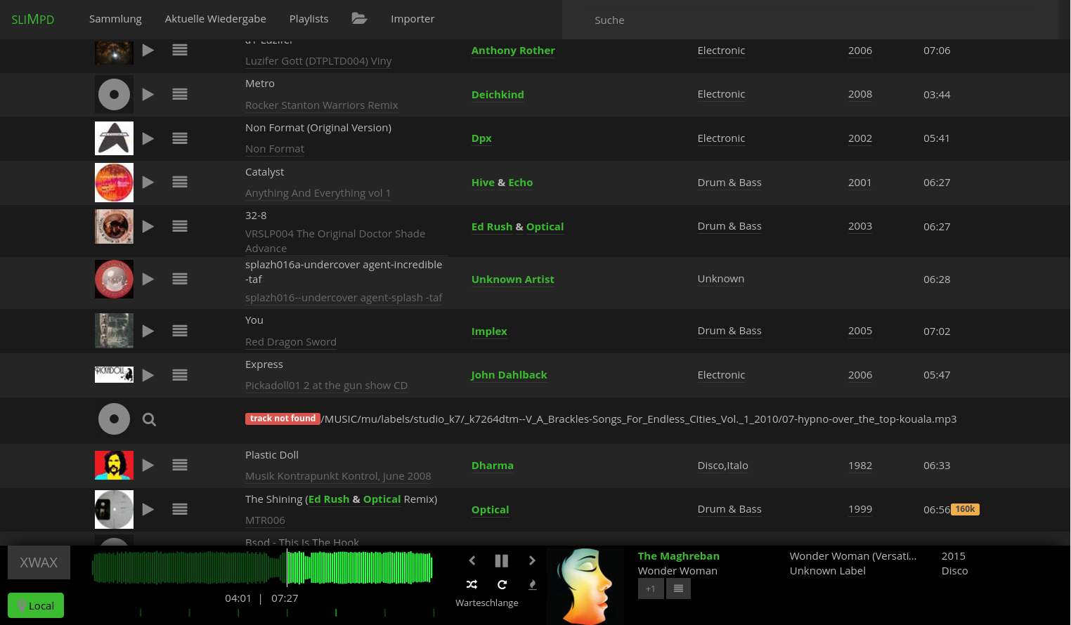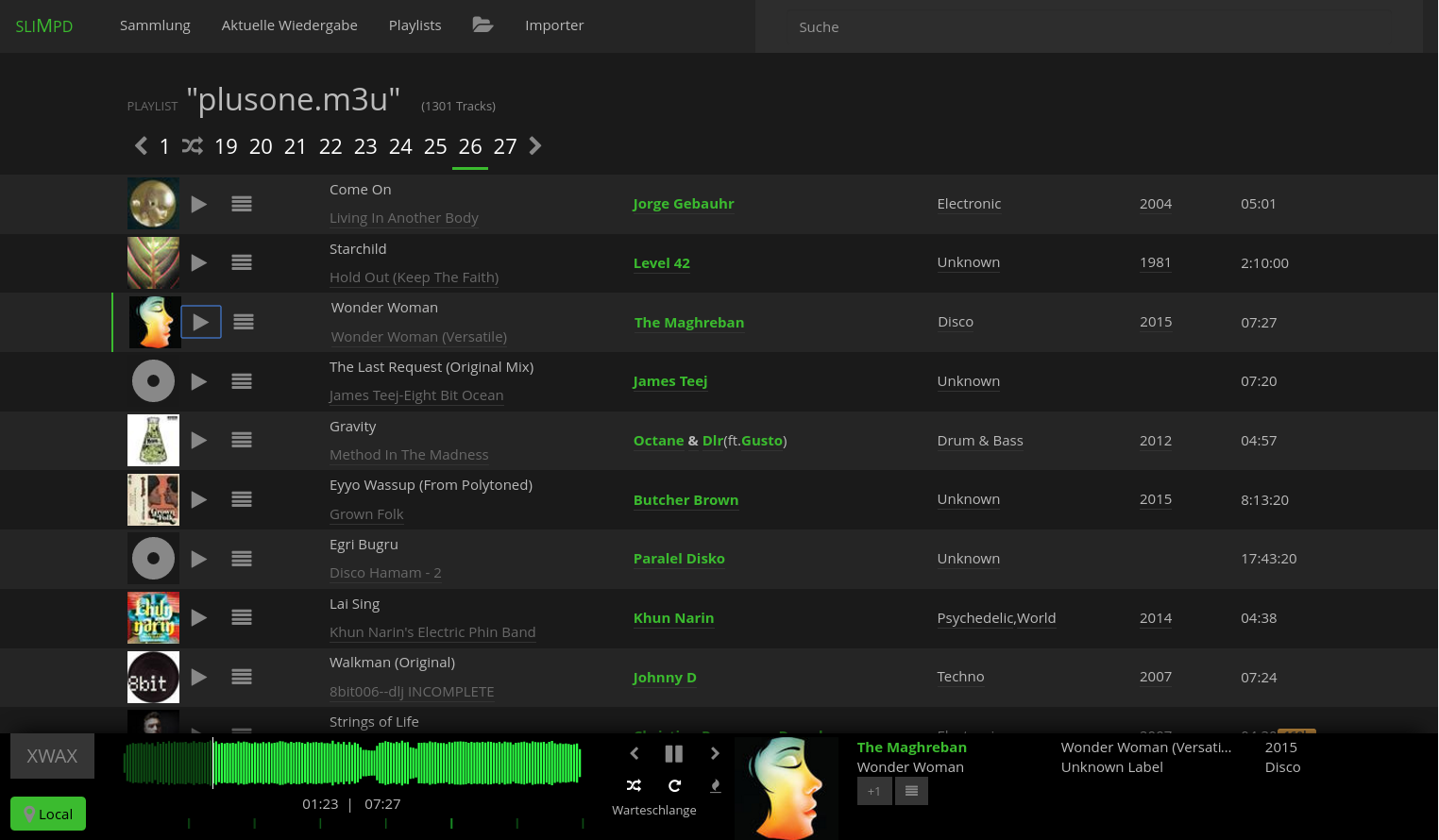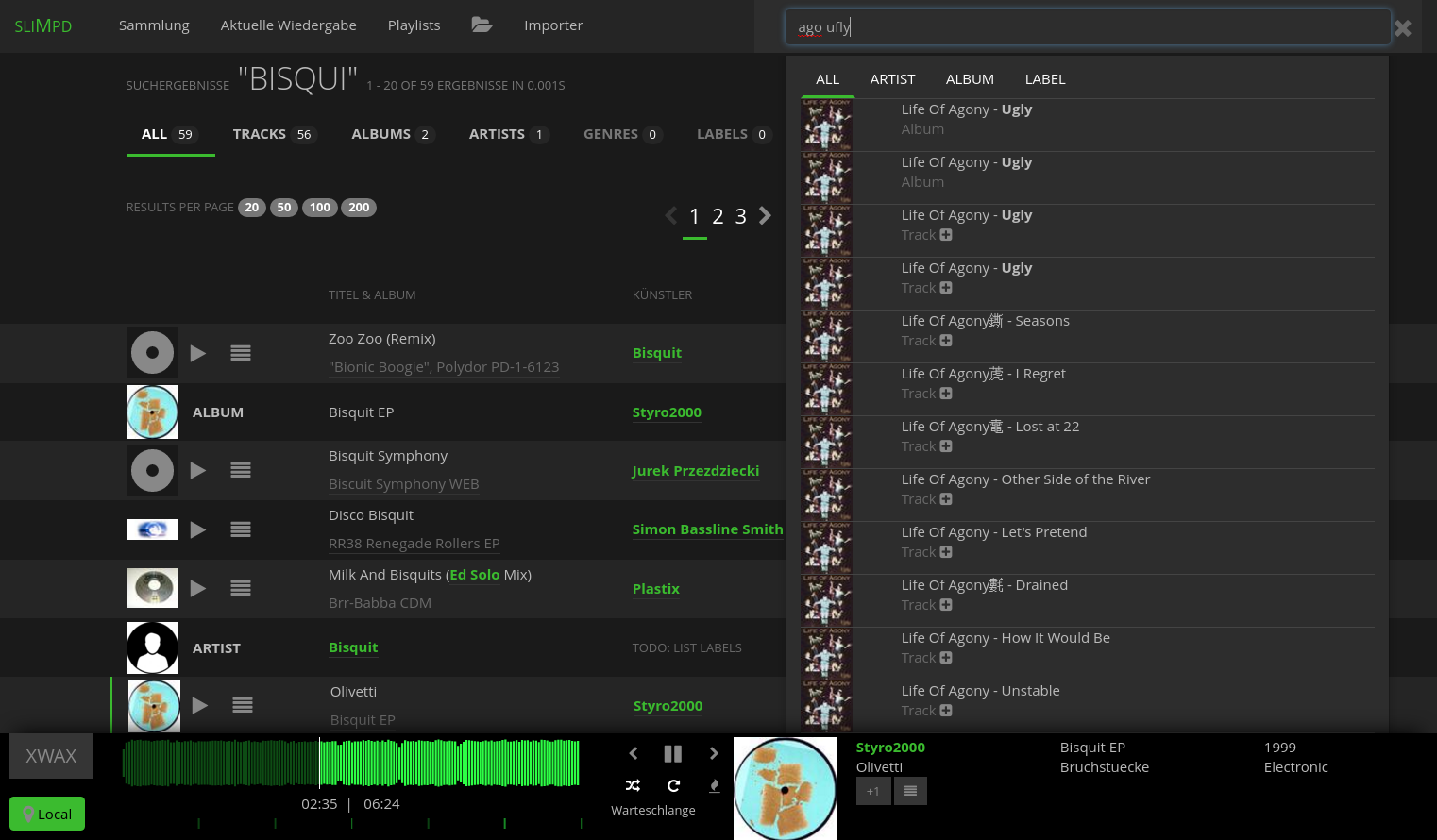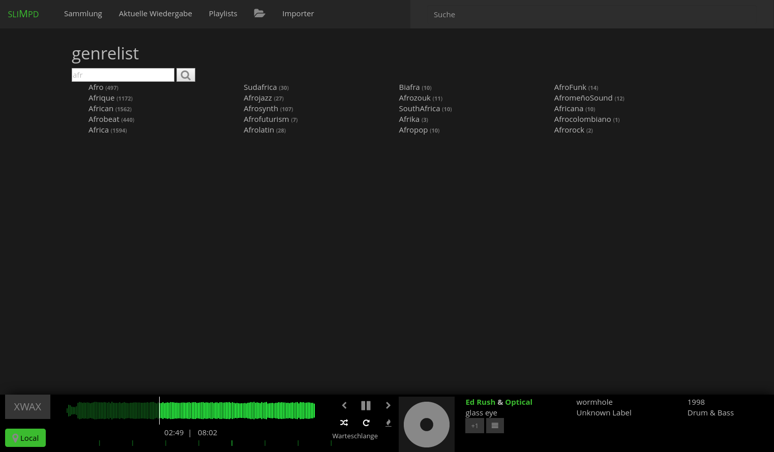 (albums, tracks, artists, genres, labels) with active local-player (green spotcolor)